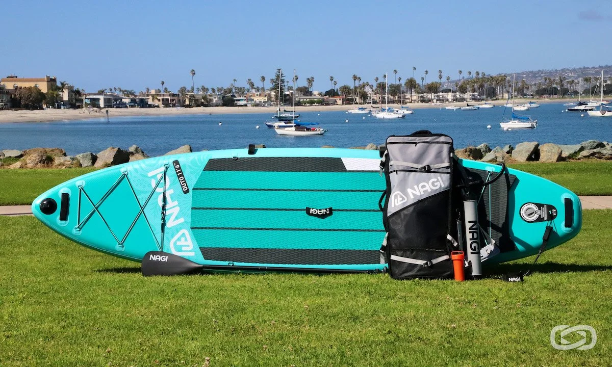 As the first time reviewing a NAGI board we weren’t sure what to expect but were pleasantly surprised with not only the quality of the board but the overall package. One of the bigger items/features that stood out was the construction and how it felt incredibly durable with the use of the military grade PVC drop-stitch material and the reinforced rails. This is something we typically see with inflatable boards that are a bit pricier so having this feature at this price point is a definite highlight. And another surprise here was even though the construction here is heavier-duty in terms of durability, you’re not feeling that when it comes to the weight of the board. When carrying and transporting the board it felt very lightweight and was easy to move around. Another surprise with the board was all the bells and whistles that it came with. From the action mount attachment on the nose, to the dual bungees on the nose and tail to the added handles on the nose and tail to the paddle holder attachments on the rail, the Inspire has so much packed in. In terms of aesthetics, the colorways on the board are pretty simple with a teal color throughout the board and then slight graphical designs on the nose of the board. When it comes to the included accessories the package has a set of three-fins which is helpful and a nice feature for those wanting to take the board out in the surf. The side bite fins seem to be a bit larger than what you’d typically want for use in the surf so with that I would probably recommend smaller surf for this board. So if you want something more high performance you might want to look at a composite (non-inflatable) option. The backpack, leash, 3-piece paddle and pump that are included are also pretty nice quality and up to industry standards. On the water my first impression is how well it glided through the water. I didn't feel a lot of drag or a lot of weight holding me down and I was able to kind of cruise with really good ease. Another thing I liked about this paddle board is that it has the raised deck pad on the back so when I was turning kind of fast I was able to turn really sharp and still feel stable. While this board is primarily marketed more towards a surf SUP, ideally I really like this more as a touring inflatable board, especially with all the add on’s and features. Overall, the quality of the construction and add on’s at this price point make the Inspire a great option for someone looking for a versatile inflatable that can work in many conditions and is also suitable for beginners.