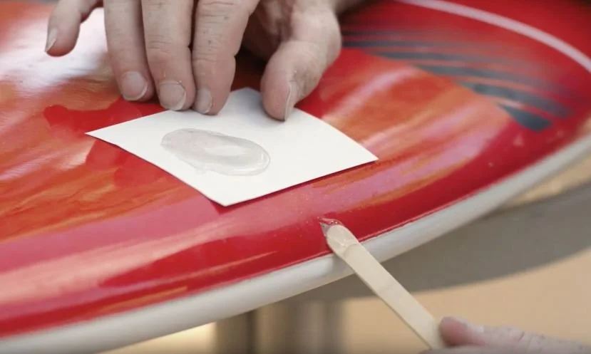 Once you’ve prepared the damaged area, now it’s time to mix the epoxy. Once you’ve mixed the epoxy take the popsicle stick and use it to completely cover up the damaged area with epoxy. Then you will cover the ding with the clear packing tape which will give the epoxy a smooth finish and will reduce the amount of sanding needed once the epoxy is cured.