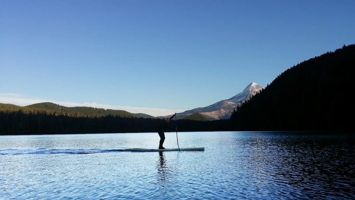 There’s disagreement between locals on which lake really has the most picturesque panorama views, Trillium Lake or Lost Lake. Most votes would likely go to Trillium Lake until you throw a paddle board in the equation, then it’s Lost Lake on any day. It’s got far more surface area to play in than Trillium Lake and there is not a single square foot of lake that doesn’t have the best view imaginable of Mt. Hood. Plus, according to the Atlas of Oregon Lakes, the glacial water is crystal clear and hovers around 68 degrees fahrenheit in the summer months. One additional feature of Lost Lake that many paddle boarders will appreciate is that motorized boats are not allowed on the lake, so no loud engines, no speeding watercraft, and no diesel gas smells in the air!
