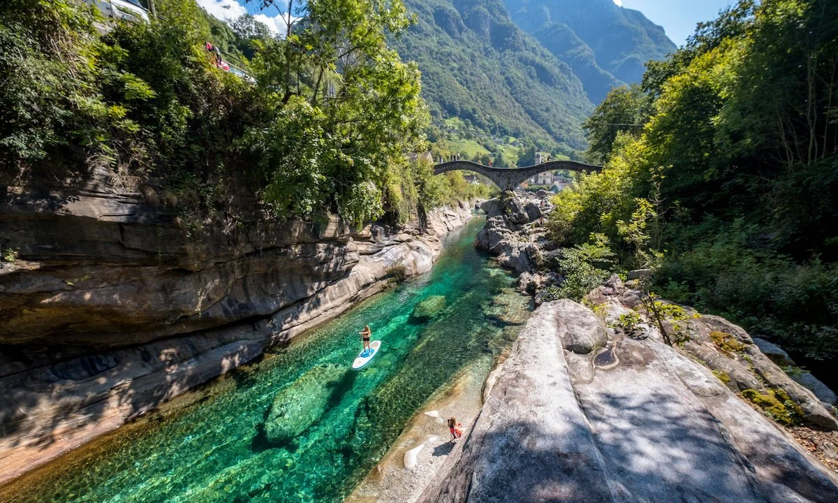 Aerial view of paddling beneath the Ponte dei Salti in Lavertezzo, Switzerland. | Photo courtesy: Nicholas Spooner