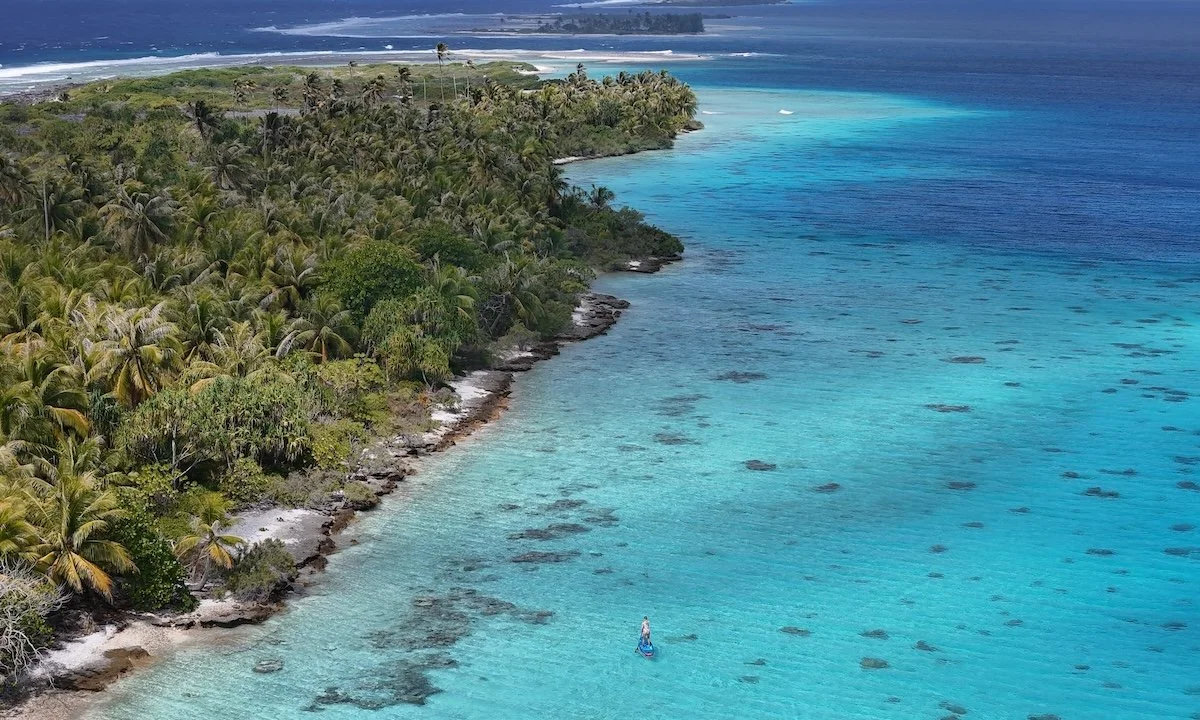 Description: My wife Dagmar Paddling the lagoon in Toau. Note the outgoing current (up to 8 knots) in the pass.