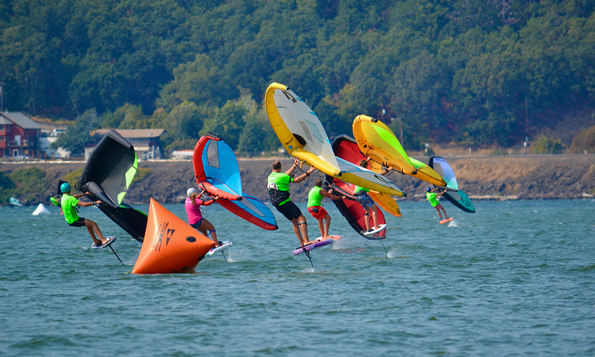The wing foiling racecourse event at the Gorge was the first of its kind in the U.S. This four buoy course with a flying start challenged participants to be in the right place at the right time to grab an early lead. Spectators had an exciting view of the inside buoy section where the wind pattern changed, challenging wing foilers to stay on foil and then maneuver around those struggling or down on the course.
