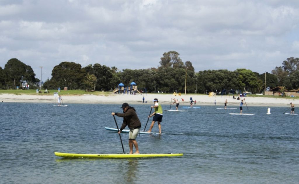 Mission Bay, San Diego to host SUP Festivities and Boardworks' Knockout Race with $1,000 Purse. Enthusiasts paddling on the calm waters of Bonita Cove in Mission Bay, San Diego with perfect conditions for the sport.