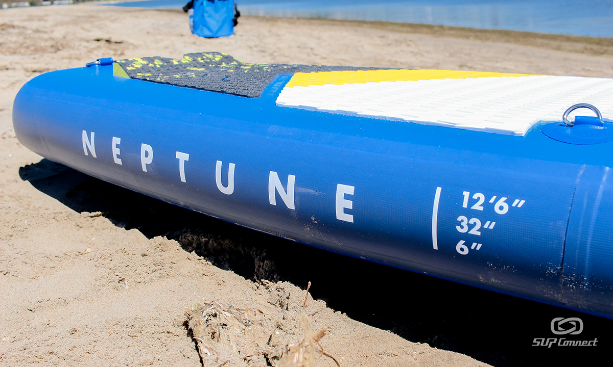 Aesthetically, the board comes with a nice set of graphics featuring dark blues with a nice accent yellow as well as a moon graphic on the deck that aligns with the theme of the brand. And what’s more, these graphics are across the package as a whole including the box the gear comes in, the bag and fin. Small details like these show the thought that goes in behind the scenes when designing the package. With its Double Layer MSL Fusion construction, the Neptune felt pretty durable while also being a lightweight board. Usually you'll find that with added layers in the construction you'll get a higher board weight but here you're not seeing that. Additionally, the board features a double chamber technology which takes the safety of this board to the next level and at the same time helps the board feel nice and stiff. These features are not too common for a board at this price point so note the value add there. In terms of accessory add ons, you’ll find plenty of D-ring attachment points on the deck, the four furthest towards the nose of the deck being for a bungee cord. Do note, the strings for the bungee do not come set up. If you want them on the board you’ll have to set them up yourself. Not a huge hassle but something to keep in mind. On the water, the board was comfortable and had a nice glide. Compared to the Aztron Terra, their other touring SUP designed for women or smaller paddlers, this board felt a bit better. The paddle was very lightweight, it looks like a lighter plastic material which was nice weight wise and it had this grooved shaft, which made it so your hands don’t slip but that being said, the quality felt lower budget and on the more fragile side. Overall, the package comes with everything you need and has a nice look to it at a reasonable price point.