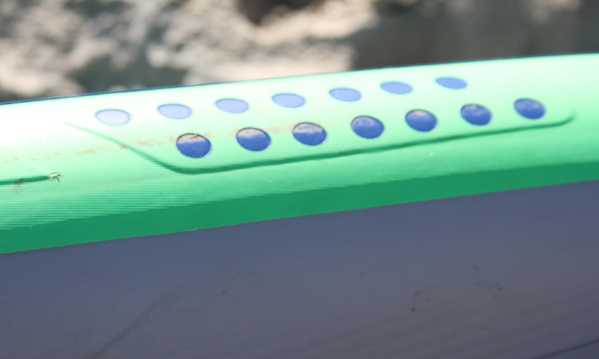 On first impressions, the graphics and color are good, the shape design is quite thoughtful and the construction strikes as strong. The Touring has some nice looks with a mix of bold colors, blues and greens that are very eye-catching. The shape design is unique for boards in these categories, offering features tailored primarily for recreational paddling, and the construction does appear tough as something that can handle a ton of use. This paddle board is easy to carry being that it weighs slightly over 23 lbs and the glide feels fast which is very surprising since inflatables aren’t usually fast. The board comes with a tool-less FCS II fin which is a perk and also has an FCS adaptor on the deck of the board which is unusual to have on an inflatable. Once you put it all together, the Touring is a very stable board that paddles pretty fast and everyone who can walk should be able to stand on it and easily paddle away.