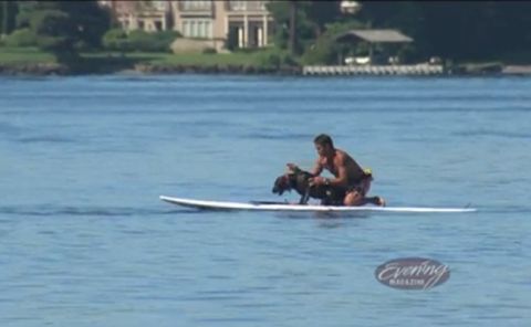 A black lab swam out too far into a lake, where a local paddleboarder came to the rescue.