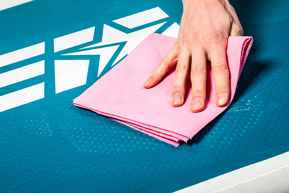 Find the leak on your SUP and start cleaning the surface of your SUP (tip: have some problems finding it? Inflate your SUP a little, apply water to the area and see where bubbles appear). Use the soap and apply it to the cloth to clean the SUP.