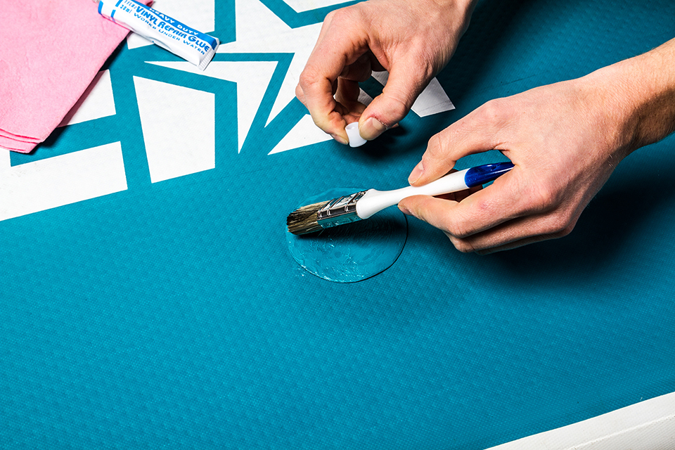 Once the patch is ready it is time to apply the glue. Take the brush, put some glue on it and apply it to both the patch and the surface on your SUP. Work your way from the center to the edges. Make sure to apply enough glue on the patch and on glue the surface the size of the patch.